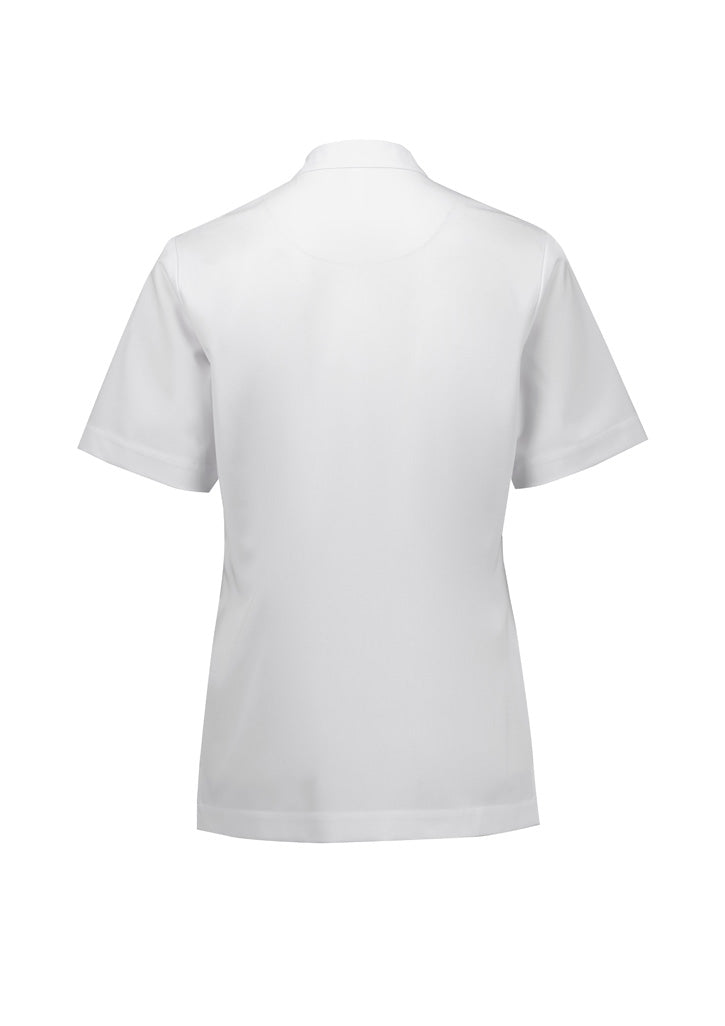 Designed to be comfortable and functional with water repellent treatment. Perfect for Beauty, Dentistry, Pharmacy and Medical industries. Modern styling, with neat standing collar and streamlined short-sleeve silhouette, creating a smart look. The asymmetrical front offers extra coverage and a flattering fit, while the ring-snap fastener closure makes it easy to slip on and go.
