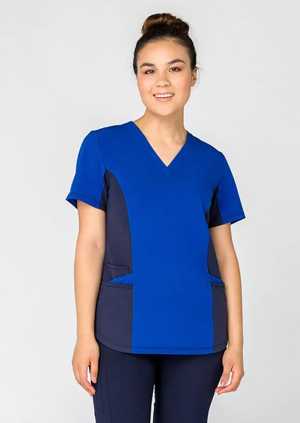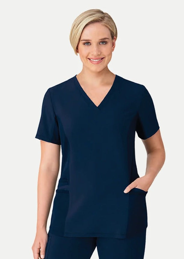 An active scrub top in a 4-way stretch easy care fabric, with anti-bacterial protection and multi-functional pockets.