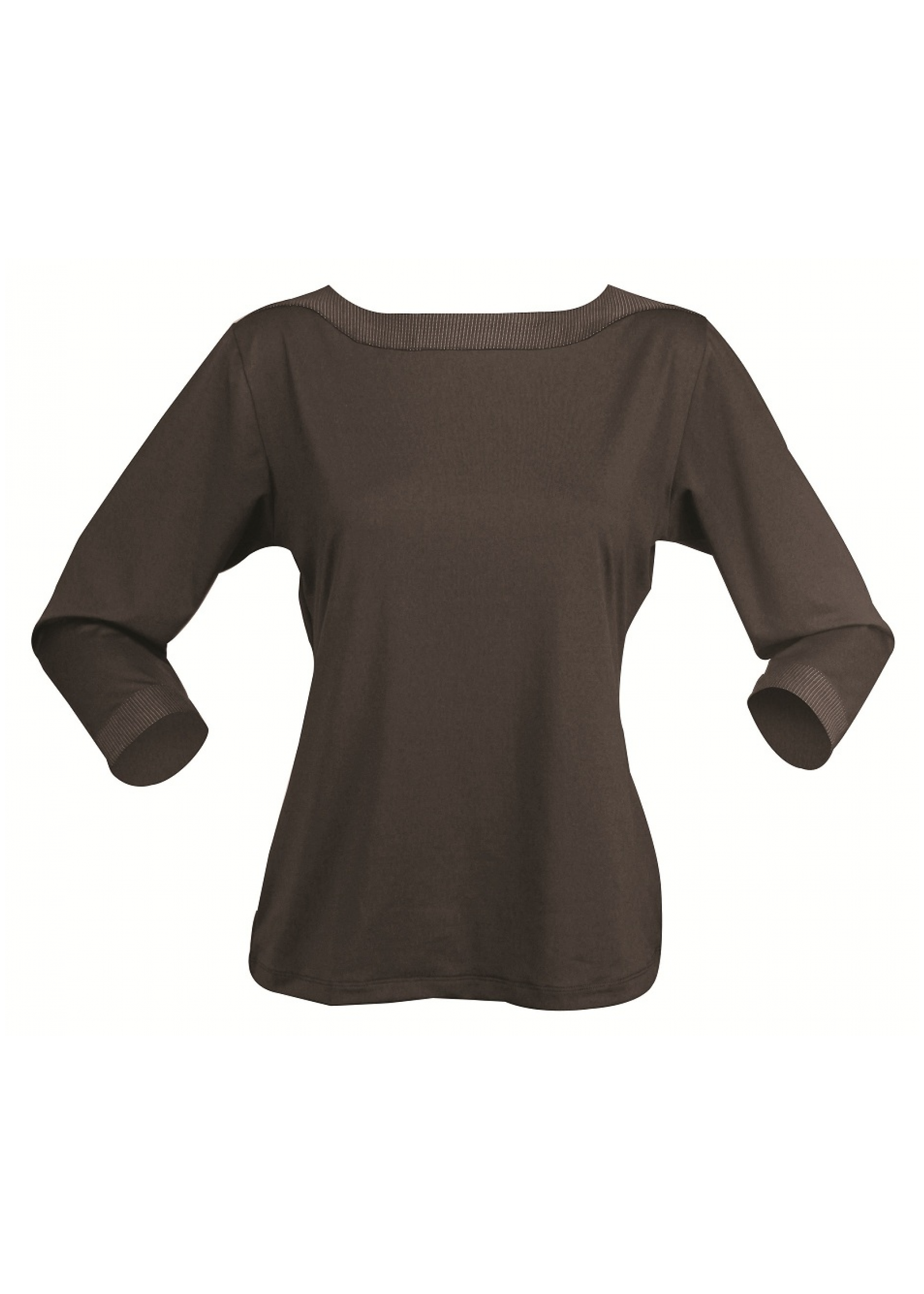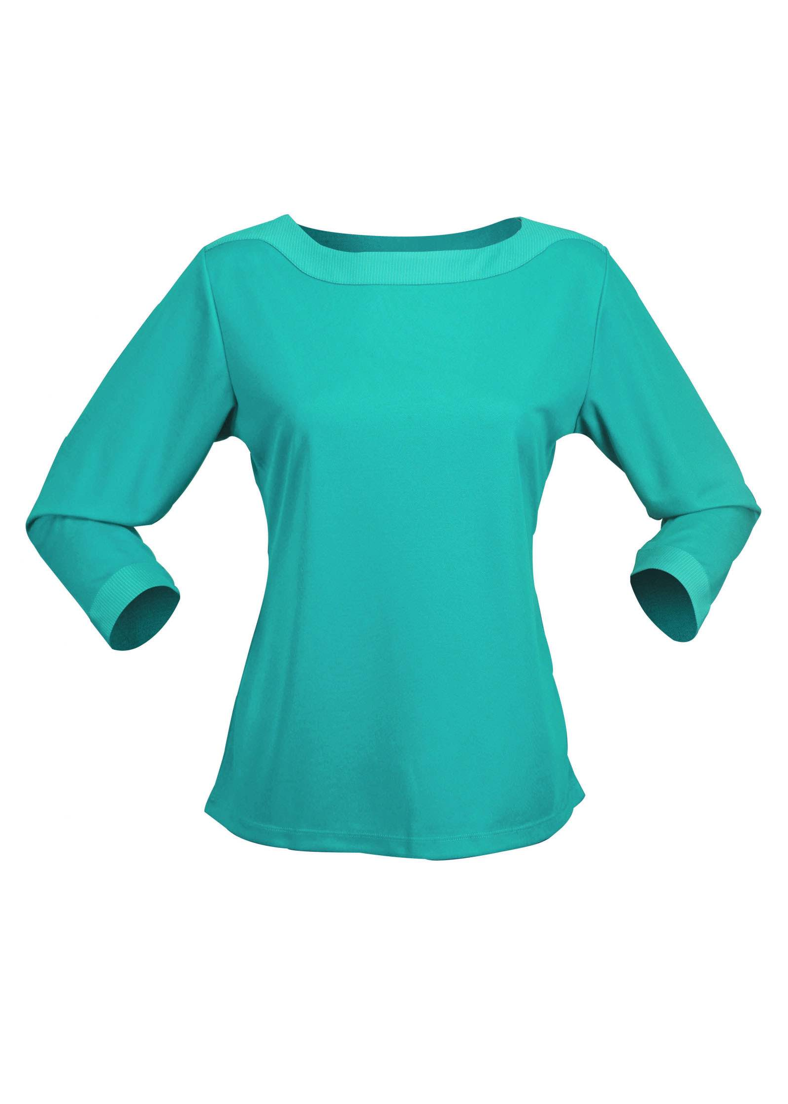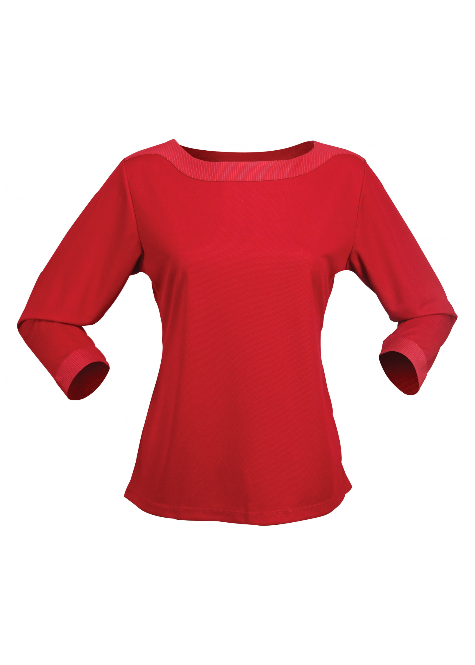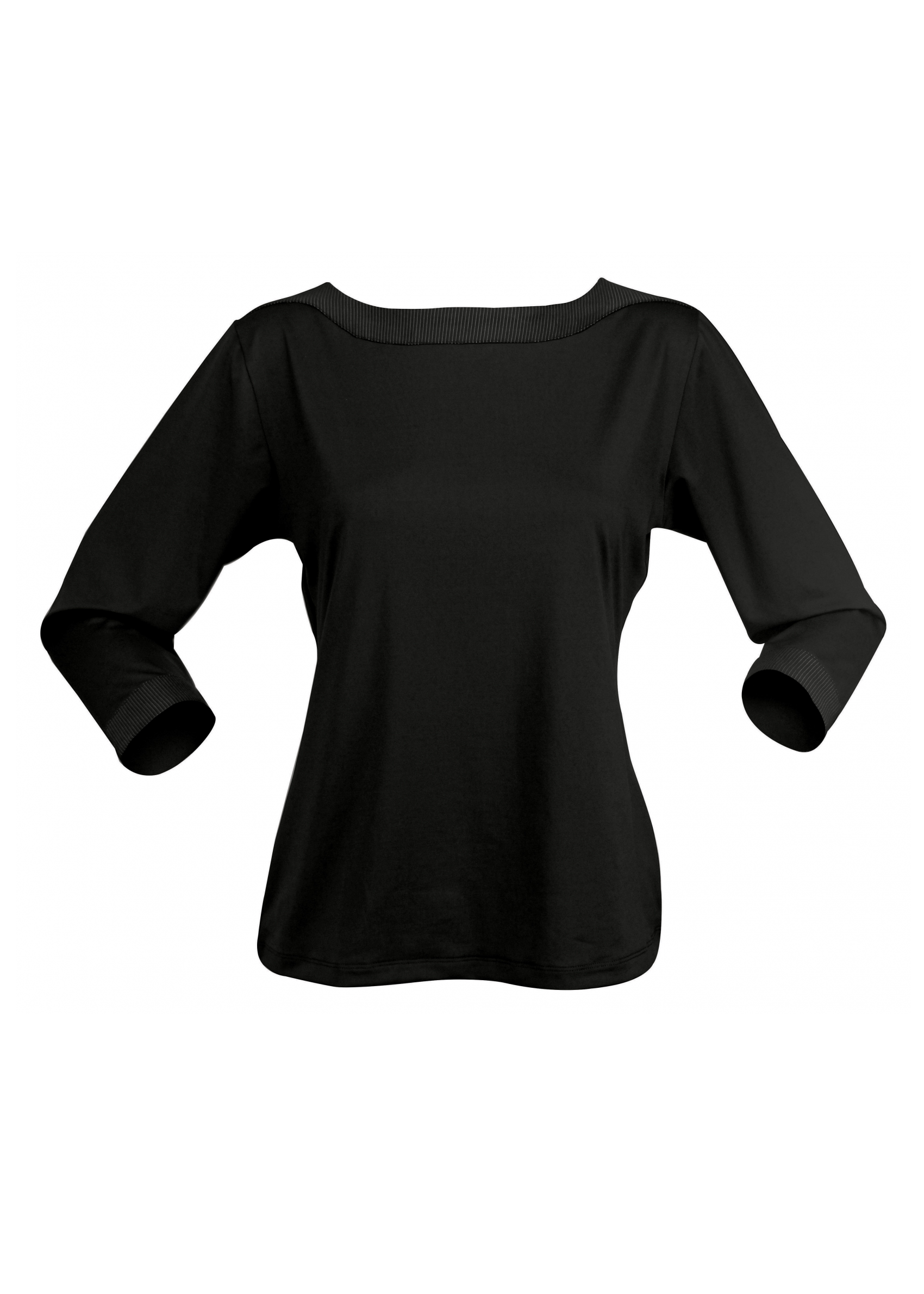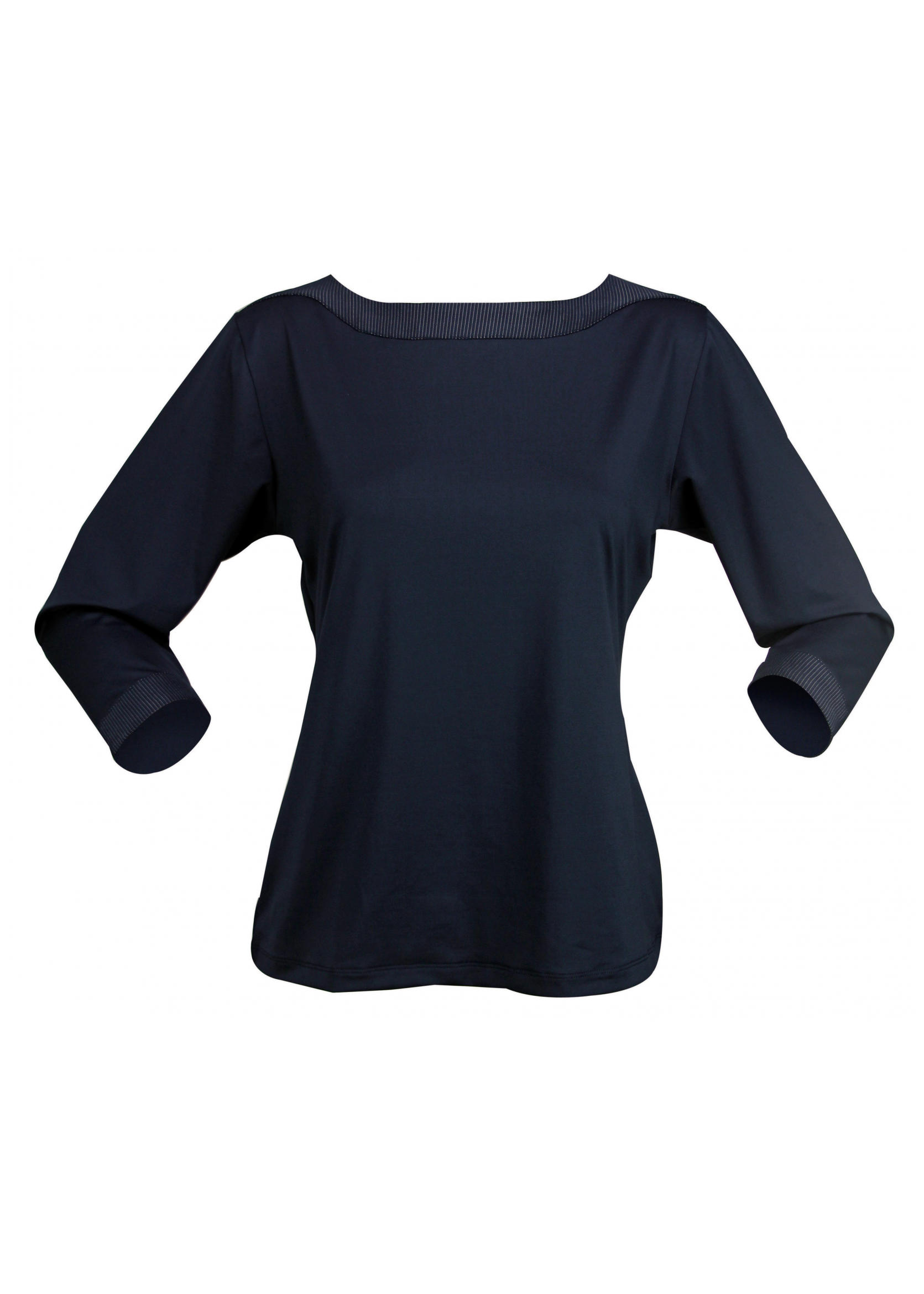 Boat neckline with distinctive striped contrast trim and sleeve band