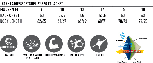 Description: Subtle, stylish and contemporary soft shell jacket. Contrast polar fleece inners, inside collar and pocket zips. Lightweight, water and wind resistant. Longer back tail creating extra warmth.